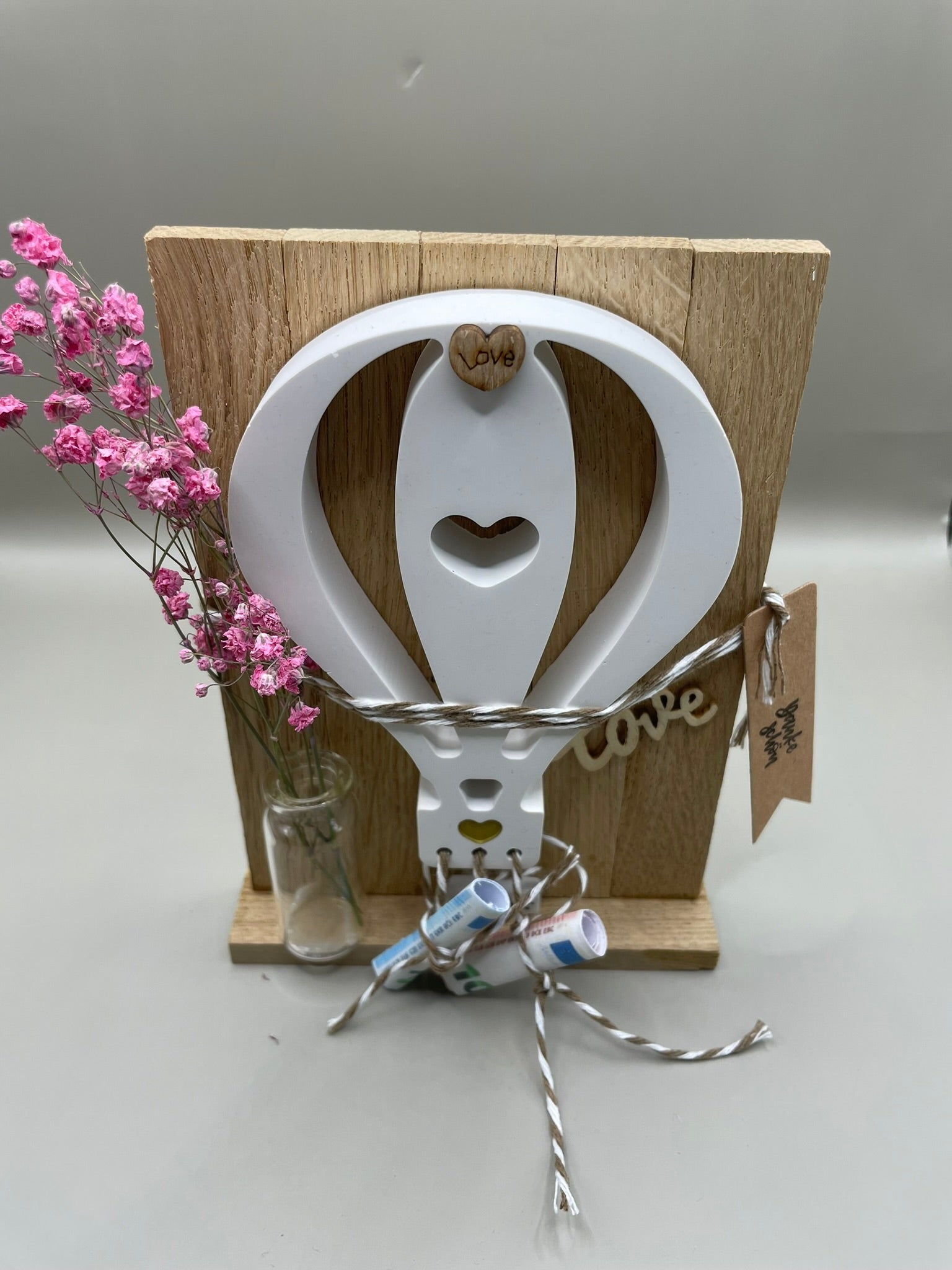 Der Heißluftballon ist von mir handgegossen aus Keracraft Keramikpulver. Alles aufgeklebt auf selbstgeleimten Holzsticks und mit kleinen Details der Liebe geschmückt. Das Herz bemale ich mit einem goldenen Acrylstift.