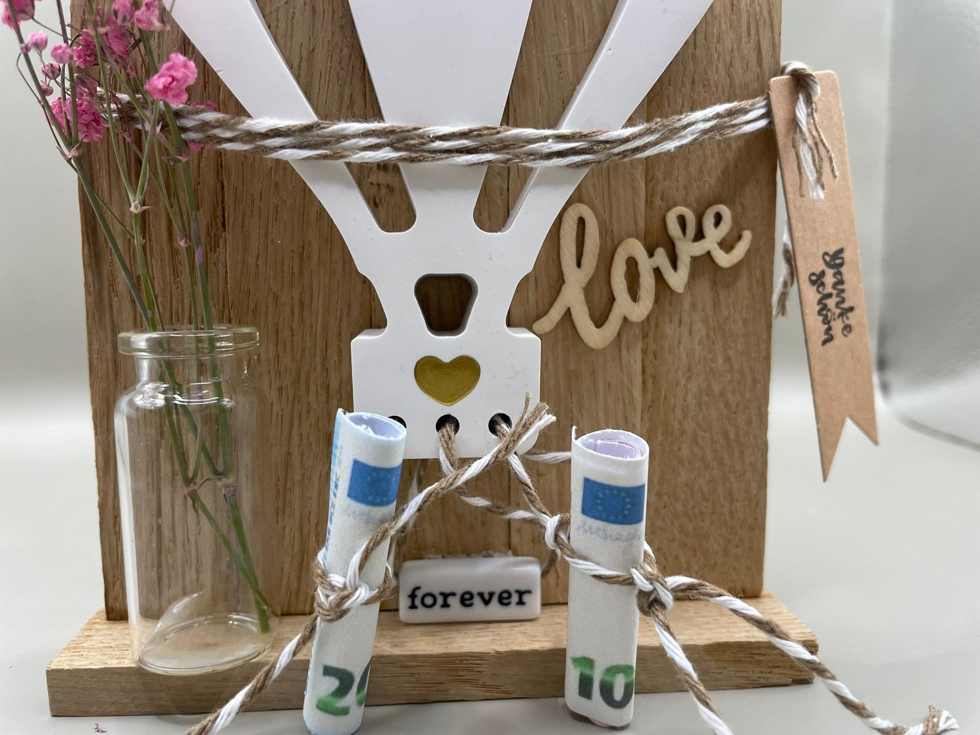 Das Geld dafür oder einen Teil davon könnt ihr zusammengerollt an die Schnüre knoten und den beiden dann zur Hochzeit schenken.